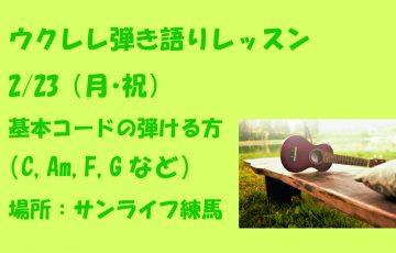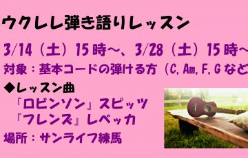 3月のウクレレレッスンのお知らせです。 3月14日(土)、3月28日(土) ◆場所:サンライフ練馬3F 職業講習室 https://sunlifenerima.sakura.ne.jp/map.html ◆対象:基本コー…