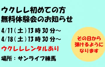 初めてのウクレレ体験会のお知らせです。 まったくウクレレをやったことの無い方も大歓迎! 4/11(土)、4/18(土) どちらも13:30~14:40 ご都合の良い日にご参加ください。 ◆場所:サンライフ練馬3F 職業講…