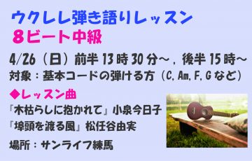 4月のウクレレレッスン(8ビート 中級) 4月26日(日) ◆場所:サンライフ練馬3F 職業講習室 https://sunlifenerima.sakura.ne.jp/map.html ◆対象:基本コードの弾ける方(C…