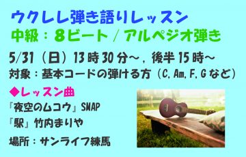 5月のウクレレレッスン(中級:8ビート/アルペジオ弾き) 5月31日(日) ◆場所:サンライフ練馬3F 職業講習室 https://sunlifenerima.sakura.ne.jp/map.html ◆対象:基本コー…