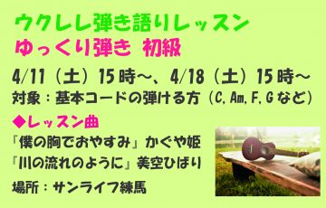 4月のウクレレレッスン(ゆっくり弾き 初級) 4月11日(土)、4月18日(土) ◆場所:サンライフ練馬3F 職業講習室 https://sunlifenerima.sakura.ne.jp/map.html ◆対象:基…