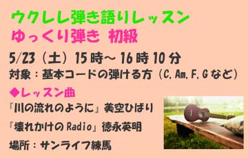 5月のウクレレレッスン(ゆっくり弾き 初級) 5月23日(土) ◆場所:サンライフ練馬3F 職業講習室 https://sunlifenerima.sakura.ne.jp/map.html ◆対象:基本コードの弾ける方…
