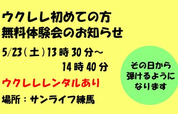 初めてのウクレレ体験会のお知らせです。 まったくウクレレをやったことの無い方も大歓迎! 5/23(土)13:30~14:40 ◆場所:サンライフ練馬3F 職業講習室 https://sunlifenerima.sakur…
